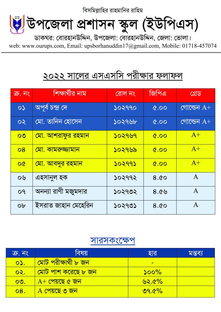 আজ ২৮ নভেম্বর ২০২২ খ্রি. তারিখ সারাদেশে ২০২২ সালের এসএসসি, দাখিল ও সমমানের ফলাফল প্রকাশিত হয়। উক্ত পরীক্ষায় উপজেলা প্রশাসন স্কুল থেকে ৮ জন পরীক্ষার্থী অংশগ্রহণ করে। এর মধ্যে ৫ জন শিক্ষার্থী A+, ৩ জন A গ্রেড পেয়ে শতভাগ পাশ করে। A+ পাওয়া শিক্ষার্থীর মধ্যে ২জন গোল্ডন A+ পেয়েছে।