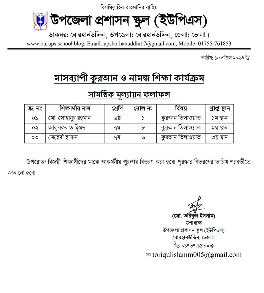 অদ্য ৮ এপ্রিল ২০২৩ খ্রি. তারিখ উপজেলা প্রশাসন স্কুল (ইউপিএস) এ প্রতিযোগিতার মাধ্যেম “মাসব্যাপী কুরআন ও নামাজ শিক্ষা” কার্যক্রমের সামষ্টিক মূল্যায়ন করা হয়। উক্ত প্রতিযোগিতার ফলাফল নিম্নরূপ…