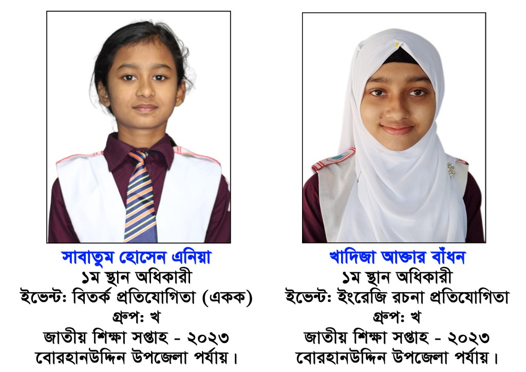 জাতীয় শিক্ষা সপ্তাহ-২০২৩ এ বোরহানউদ্দিন উপজেলা পর্যায়ে অংশগ্রহণ করে অত্র স্কুলের ১০ম শ্রেণির ছাত্রী খাদিজা আক্তার বাঁধন, খ গ্রুপের ইংরেজি রচনা প্রতিযোগিতায় ১ম স্থান এবং সাবাতুম হোসেন এনিয়া, বিতর্ক প্রতিযোগিতা (একক) ১ম স্থান অধিকার করে ভোলা জেলা পর্যায়ে অংশগ্রহণ করার সুযোগ পেয়েছে।