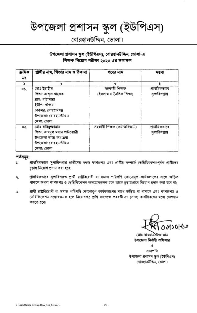নিয়োগ কমিটির সিদ্ধান্ত মোতাবেক নিম্মোক্ত দুই জনকে প্রাথমিকভাবে সহকারী শিক্ষক (সামাজিক বিজ্ঞান) ও সহকারী শিক্ষক (ধর্ম) বিষয়ে সুপারিশ করা হয়।