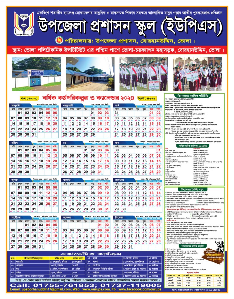 অদ্য ৯ নভেম্বর ২০২৩ খ্রি. তারিখ উপজেলা প্রশাসন স্কুল (ইউপিএস), বোরহানউদ্দিন এর ২০২৪ শিক্ষাবর্ষের একাডেমিক ক্যালেন্ডার প্রকাশিত হয়েছে। উক্ত ক্যালেন্ডারের আলোকে ইউপিএস এর সকল কার্যক্রম পরিচালনা হবে।